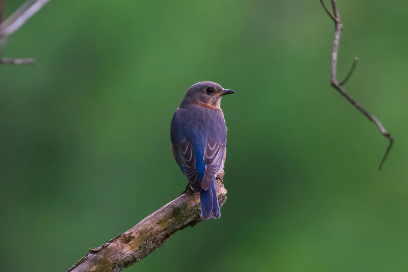 An eastern bluebird, back turned to the camera, on a tree branch.